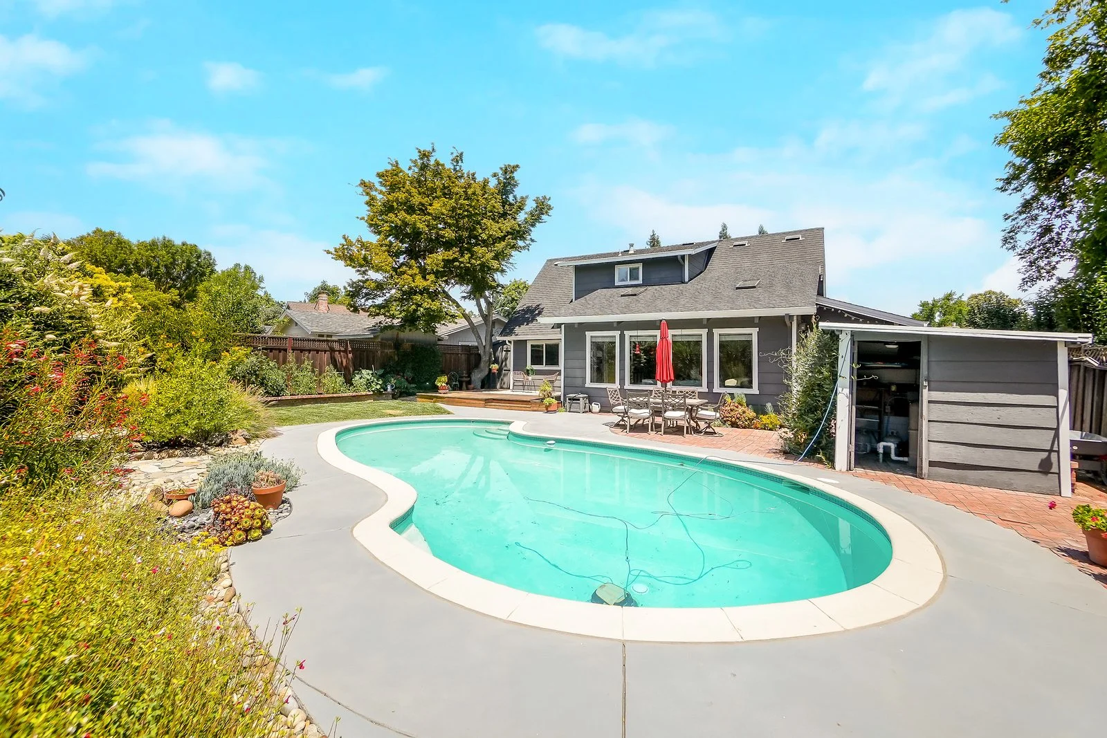 Step outside to a private backyard retreat featuring a spacious wood deck, brick patio, and lush, mature landscaping. Whether you’re hosting friends, enjoying a quiet morning coffee, or taking in a sunny Pleasanton afternoon by the pool, this outdoor space truly elevates the lifestyle.